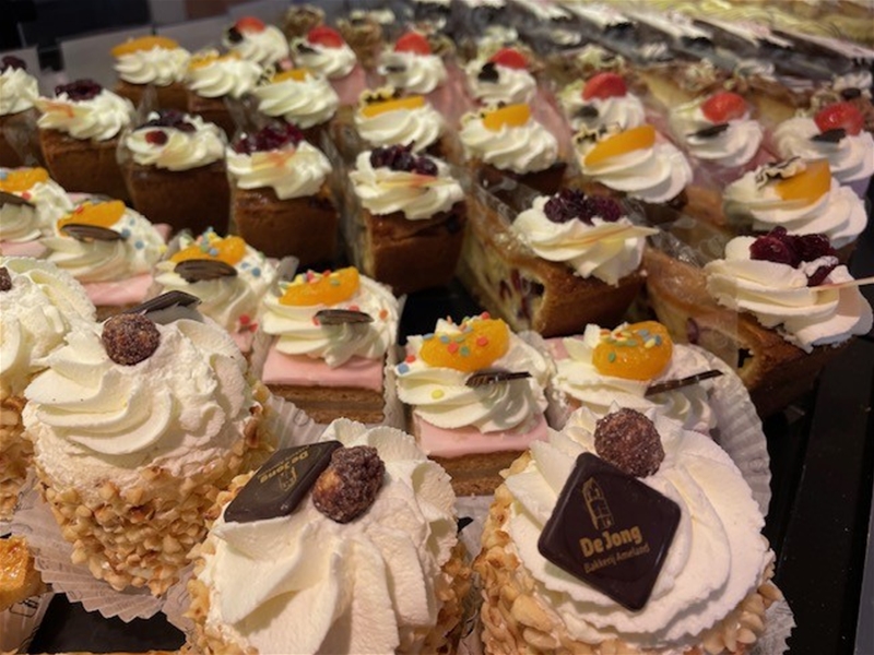 appelcarree, hazelnoot-schuim, oranjekoekstukje, appelcranberrypunt, appelperzikpunt, mokkapunt, aardbei-kwarkpunt, sacherpunt, swartzwalderkirschpunt, slagroomcakegebak, parijse soes, moorkop, slagroomhoorn, bananensoes, tompouce, aardbei-vlaaitje.